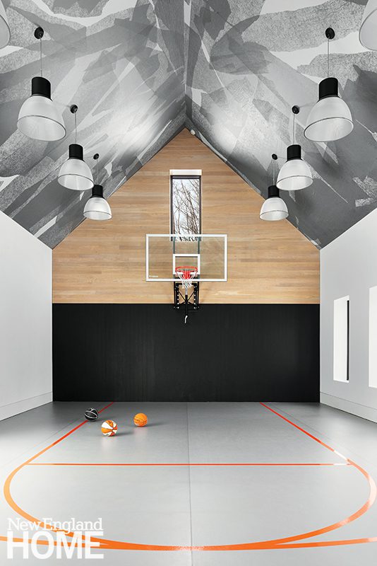 Because the family didn’t want the house to take itself too seriously, Kotchen added touches of whimsy, like an orange ski lift bench docked against a custom freehand watercolor wallcovering in the mudroom; a white faux-antler chandelier in the great room; and another hand-painted wallpaper on the ceiling of the basketball court.