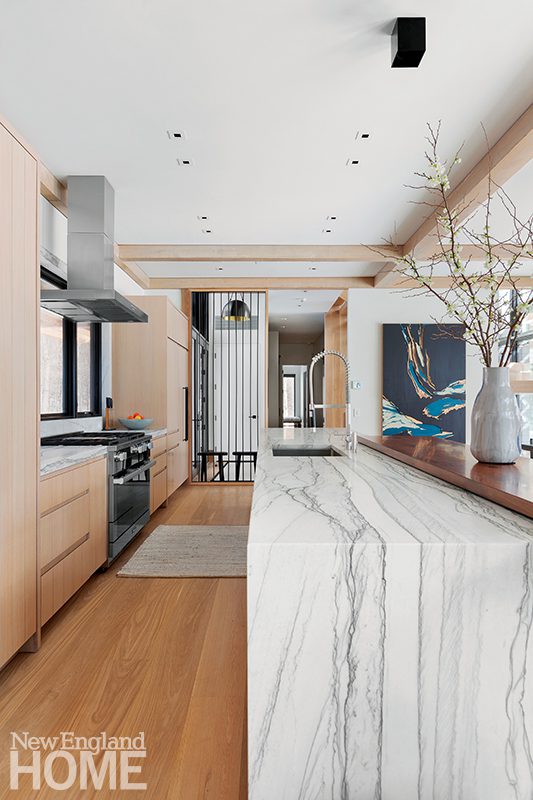 Inside, white oak and cold-rolled patinated steel form the envelope. The focus, of course, is Mount Greylock, its majesty visible through eighteen-foot-tall windows in the great room, which accommodates a kitchen and living and dining areas.