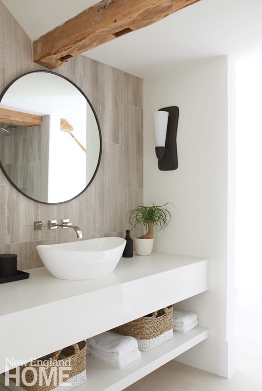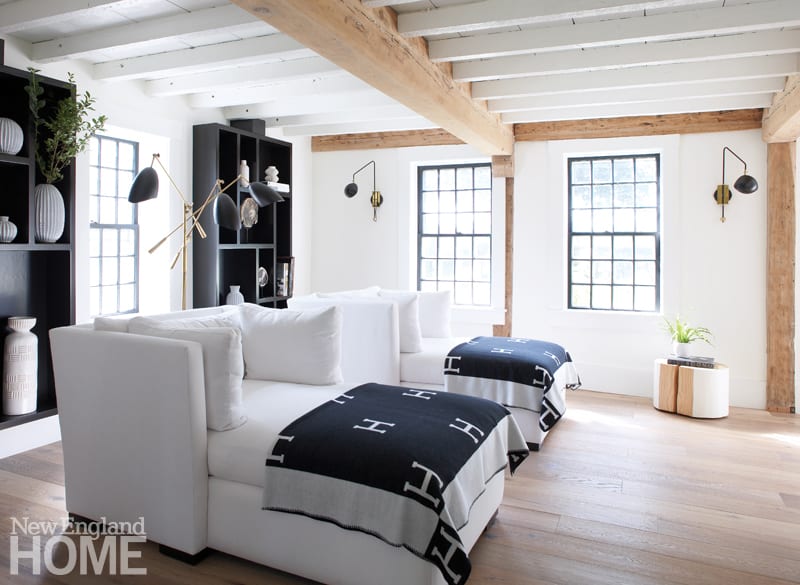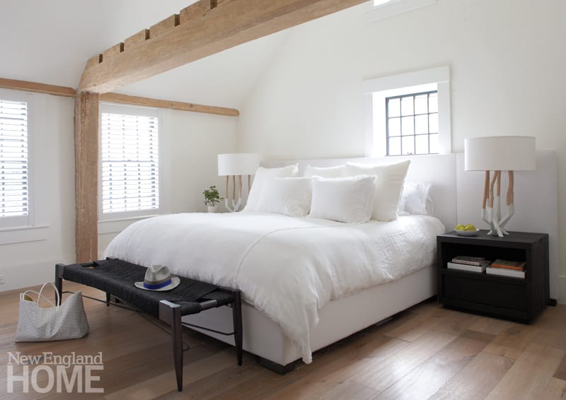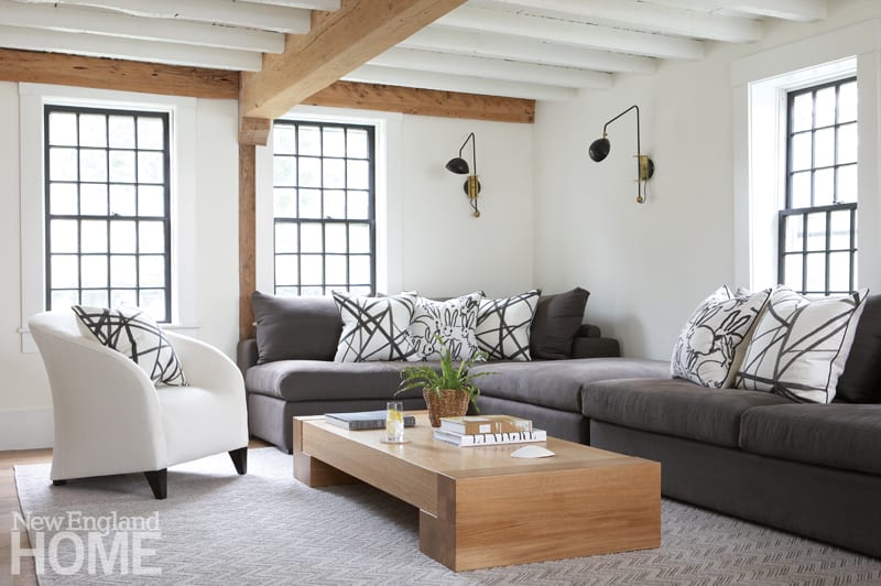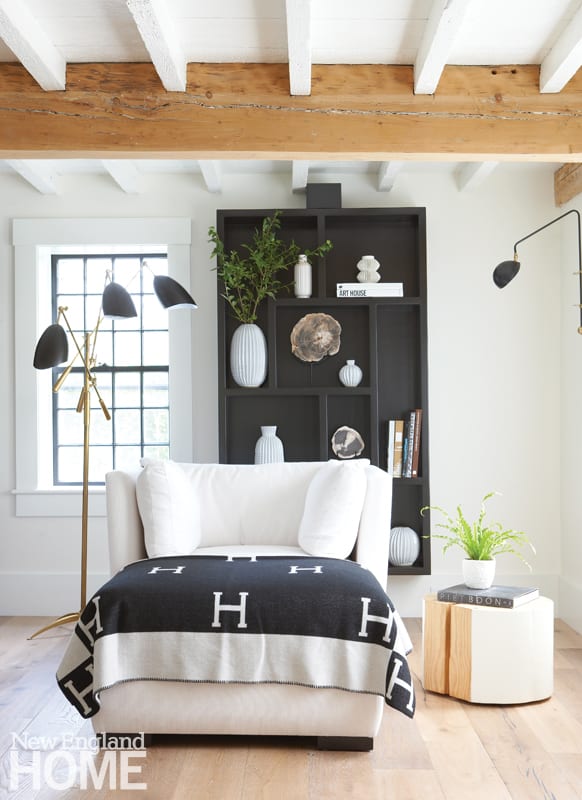 For the wife, celebrating the structure’s surviving colonial details was key. “That’s why we fell for this home,” she says. “It had the low ceiling beams, it had all the original fireplaces. We wanted to keep that integrity; we just wanted to modernize it.”