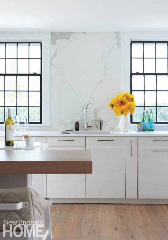 For an antidote to the 1970s-era kitchen, Balsbaugh called on SieMatic of Boston. The room was rearranged and re-plumbed and brought into the present with a marble backsplash, lacquered cabinets capped with slender white quartz, and an island with a three-inch-thick oak breakfast bar.