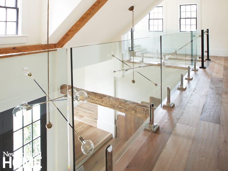 In what was perhaps the most dramatic move, after removing the ceiling above the dining room, the homeowners and their design pros decided to leave only the centuries-old beams that once supported the second floor. They traverse the dining area, ending as support for a balcony-like walkway that runs past the second-floor bedrooms. Ringing the walkway is a railing made of glass panels on metal mounts—counter-colonial elements that are reprised in the rods and globes of two chandeliers that dangle in the air nearby. “I wanted something airy and modern, that would work with the glass and metal railing system,” Balsbaugh says. “I loved the connectiveness.”