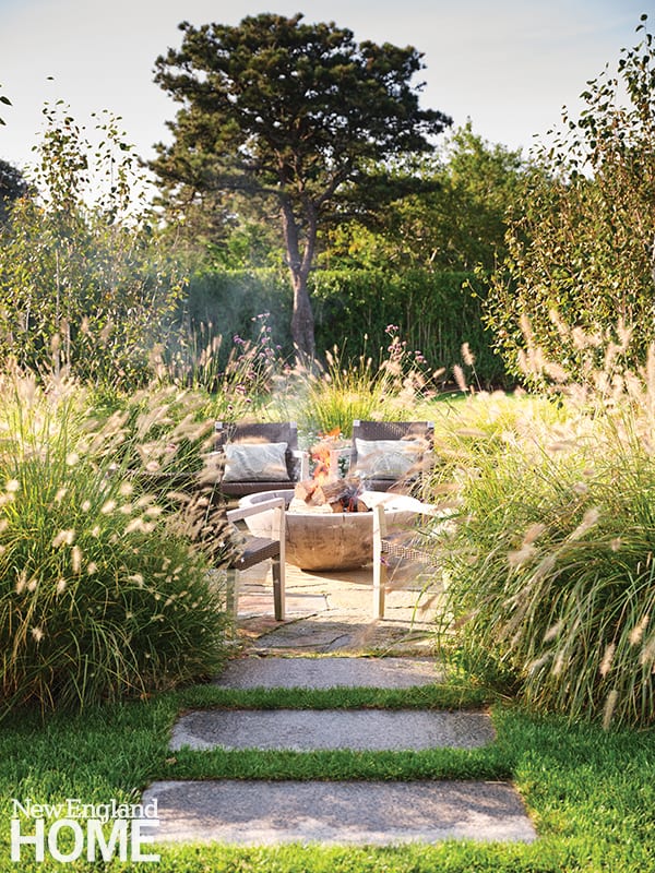 A firepit, pergola-covered Ping-Pong table, half basketball court, and an in-ground trampoline round out the outdoor oasis fit for an active family (the clients have three teenage boys). “The program was driven by recreation and entertainment,” notes local landscape designer David Troast, who also imagined an entirely new planting scheme with privacy in mind.