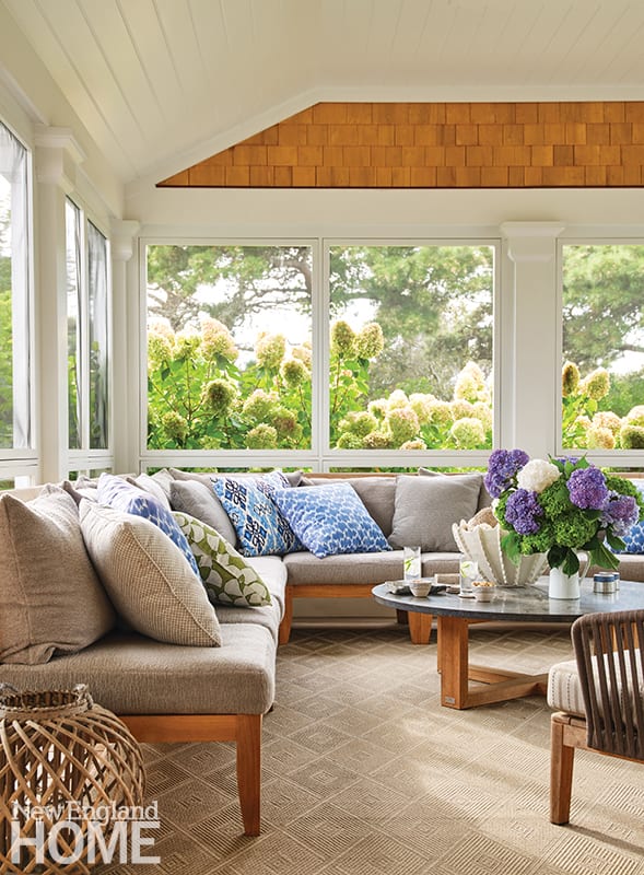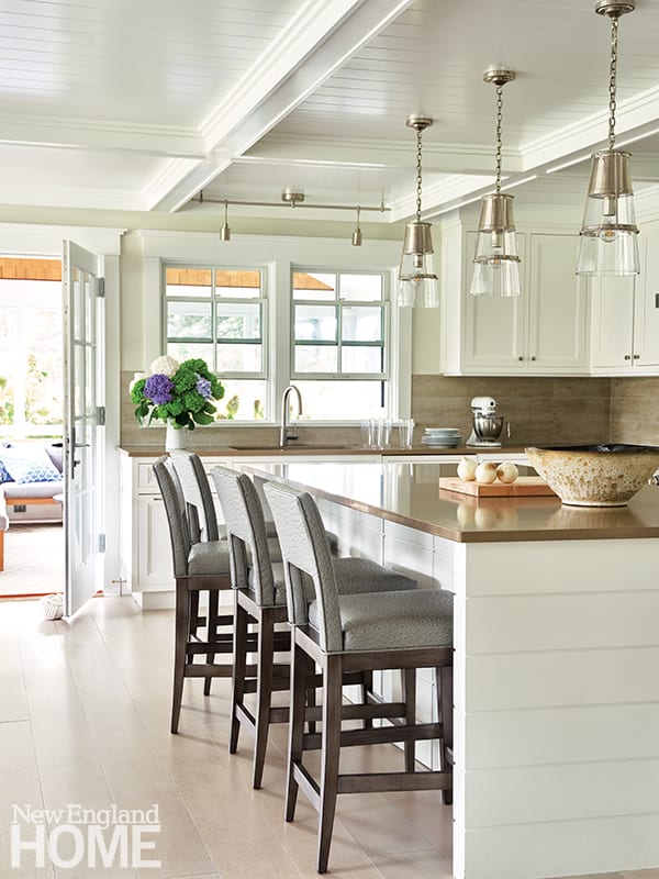 One such addition was the front porch, which had appeared in Webster’s previous plans but was never constructed. In collaboration with Hay and local builder Ron Winters, Webster tackled other exterior modifications including removing the widow’s walk, adding a balcony off the main bedroom, and building a three-season porch. Inside, the design team entirely reconfigured the first floor, with the biggest change being the relocation of the kitchen from the front of the house to the back, where it’s open to both the living and dining areas. “The way people are living is different than it was three decades ago,” explains Webster. “Now, the kitchen is the heart and soul of a house and is connected to everything else.”