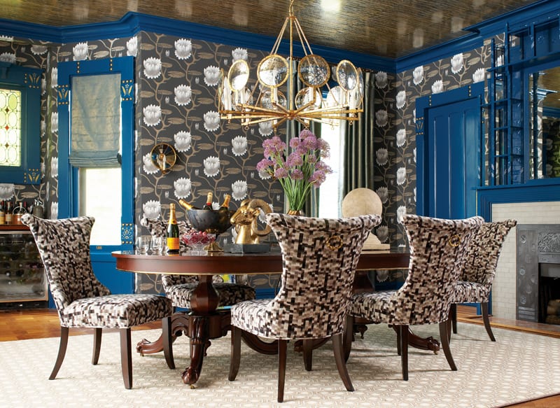 The original wood trim throughout the first floor also received lots of attention from Taylor Moore of Moore Carpenters. His team of six “took off 100 years of paint, lacquer, stencils, and wallpaper, stripping it down to nothing and starting from scratch,” Moore says. Benjamin Moore’s Adriatic Sea washes across the dining room, causing jaws to drop the moment one walks through the front door. “That teal trim was something that really resonated with me,” says Sandi. “In a circa-1882 house, you don’t expect to see statement wallpaper and teal trim, and I think that’s really fun.” A metallic wallpaper on the ceiling adds a magical glow for entertaining.
