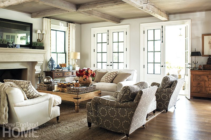 In the winter, she and her husband spend more time in the living room, which is just as cozy and laid-back as the family room, with its paneled ceiling and reclaimed wood beams that came from a defunct factory in northwestern Connecticut. The palette of warm neutrals throughout the house is augmented by the layering of textures—linens, seagrass, canvas, and grasscloth. “I wanted the whole house to feel like you could kick off your shoes and curl up on the sofa with a glass of wine,” Green says. Indeed, nothing is precious, including the quintessentially English George Smith armchairs by the living-room fireplace. “Don’t look too closely,” cautions Green. “They have been clawed to death by my cats.”