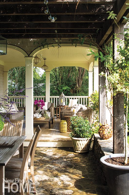 The family room that opens onto the kitchen is used not only for everyday meals but also for most of the couple’s entertaining. In warm weather, they prefer to dine on the adjacent covered porch and terrace made of antique fieldstones. “It took a while for us to get it right,” she says. “We wanted the pergola covered in wisteria to look like it was 100 years old.”