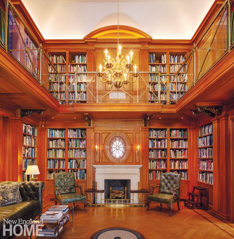 Architect JP Couture, builder Glenn Parker, and numerous artisans collaborated to realize homeowner Ron Fleming’s vision: a library of 6,000 books arranged on hand-waxed pine shelves nestled within the same Adamesque garden building as a marble nymphaeum, a type of room, historically featuring a fountain and used for relaxation, that dates back to Roman times.