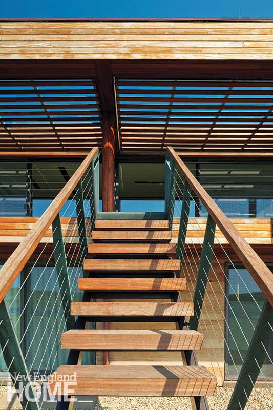 The result is a structure that opens and closes, much like that quahog, to its environment. The six 100-pound shutters rise and lower to protect windows; large screens glide at the touch of a finger to cover the exteriors of east-facing rooms. One of the most intricate and amazing features is a sixteen-foot-long skylight built in England that hydraulically opens to a vast roof deck atop a set of glass stairs. Visitors say that on a blue-sky day it’s like walking up to heaven.