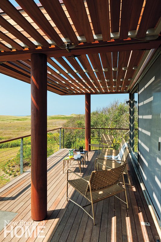 In the bloom of summer, when the owners—a pair of Europeans who make the Vineyard their vacation home—return, the thirteen-foot-wide shutters mechanically rise to let sunlight in, opening the view to an endless sea of scrub, sky, and water. Fastened into a roof structure, they begin their warm-weather function as a brise-soleil, cutting the sun’s glare into the main living spaces of the house and providing shade for the second-floor deck.