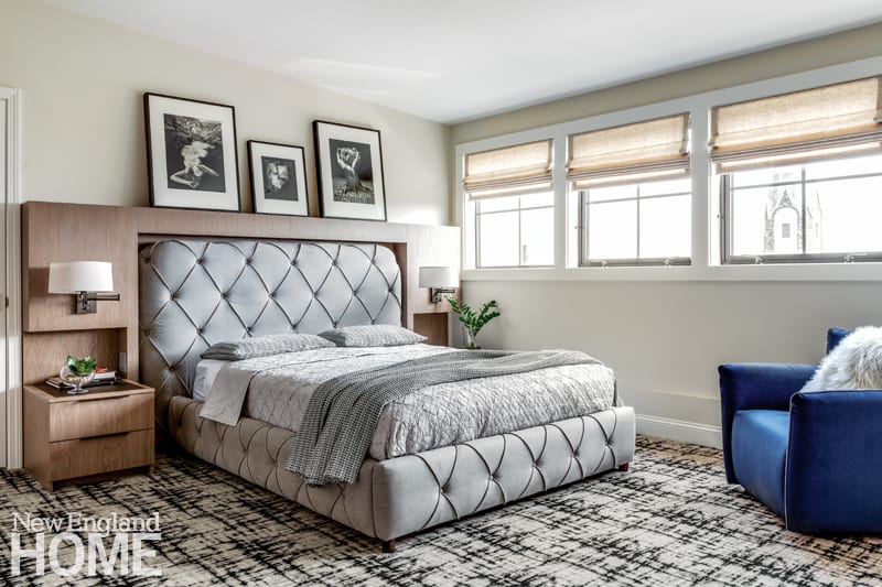 Art also finds its way to the second floor and into the reworked master bedroom, where once a staid Queen Anne spindle bed held court. Duffy designed a walnut-stained bed that incorporates two-drawer nightstands. A bronze mirror tops each nightstand. Photos by Jerry -Uelsmann rest above the tufted headboard. And whisking away the last of yesterday’s vibes, a contemporary wool rug from Stark covers the floor.