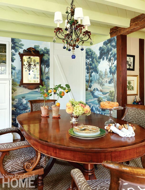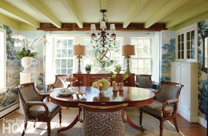 This evocative space is as much a breakfast room, library, workroom, bar, craft area, and den as it is a garden-themed dining room in Carey Karlan’s tiny English cottage. “It’s cheerful and accessible by day, but special enough for formal entertaining,” says the Darien designer. Karlan created a delightful backdrop with a wallpaper—aptly called English Parks—depicting secret gardens, little bridges, fountains, charming follies, and wandering paths that all lend a touch of romance. Oversize chairs encourage lingering around the table. The designer added touches of glamour, such as the vintage Lucite “ghost bar,” and keeps a rotating collection of garden-related pieces that hold meaning to her. “I have fond memories of finding each and every vintage piece to accessorize the space, and I enjoy changing them with the seasons,” she says. “I love that creative outlet.” Mostly she loves the feeling of being connected to manicured gardens year-round. “It makes me feel civilized and ready to host my friends and family in a gracious and special way.”