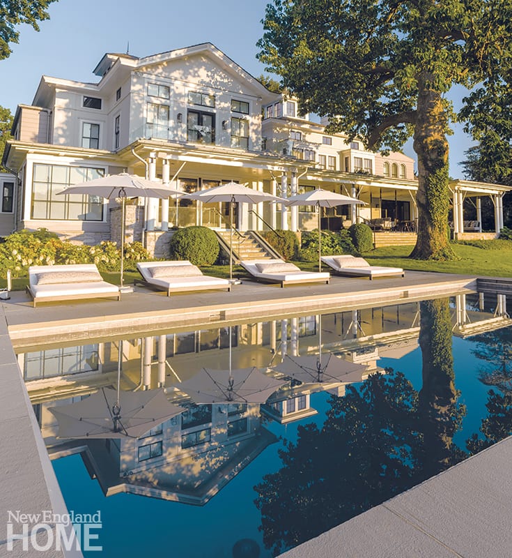 In the backyard, which leads to a private dock, the designers created a covered terrace and beautiful granite fire feature, however, the existing pool needed to be replaced; its paving endangered the roots of a stunning, roughly 150-year-old cucumber magnolia, a rare survivor of 2012’s Hurricane Sandy.