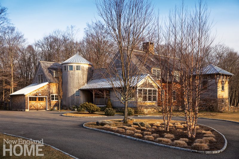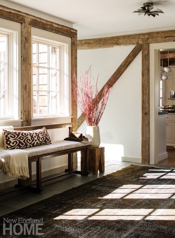 Where the original interior drew its character from timbered beams and walls clad in alder, Bow opted to emphasize the simplicity of rural life with a more neutral backdrop. Leaving the beams to speak for themselves, she subdued the walls with subtle wallpapers and softened the woodwork with shade-shifting, unobtrusive paint hues such as Sherwin Williams’s Sea Salt. “There wasn’t one inch of this house that wasn’t repainted or re-wallpapered,” says Bow, who called in Rob Horrigan, the home’s original builder, and Roxbury painting contractor Grady McAuliffe to tackle the job. Undaunted by the breadth of the renovation, Horrigan nonetheless remembers three aspects as particularly challenging. These included wallpapering the two-story silo, refinishing the dark green tile in the master bath with a brighter, painted finish, and smoothing out and painting the knotty woodwork that had been a hallmark of the original interior. “That was a process in itself,” he said.
