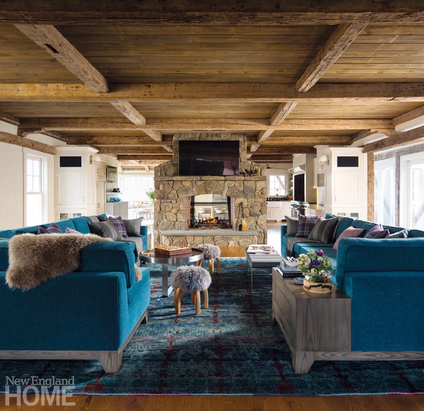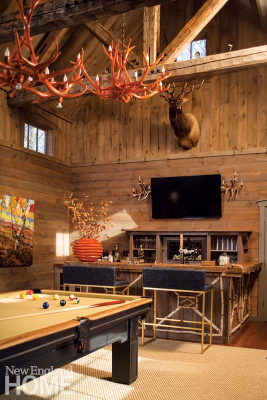 The designer also used color to add imagination to elements that, in their original state, embodied the home’s hunting-lodge vibe. Chandeliers made of animal horn took on a completely different look after being painted orange (in the great room) or navy (in the husband’s office).