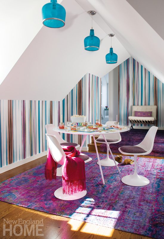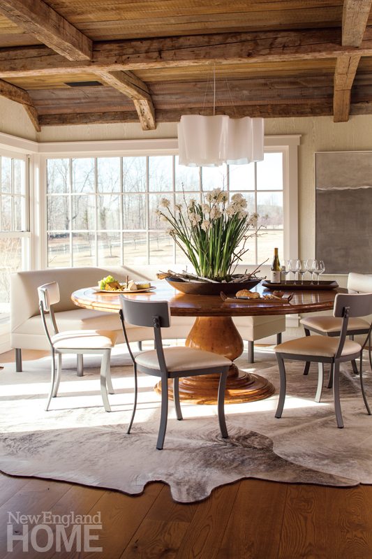 In the dining room, Bow applied her inventiveness to another carryover piece, a traditional pedestal table. She introduced a family-friendly custom settee topped with stain-resistant white vinyl. She then embraced the room’s asymmetry with the most asymmetrical of floor coverings—a one-of-a-kind rug pieced together from eight animal hides. She started with a paper template and worked with craftspeople at Stark Carpet to fit the pieces together. “We put them in like a puzzle, and then they quilted it and backed it. It looks seamless,” she says.