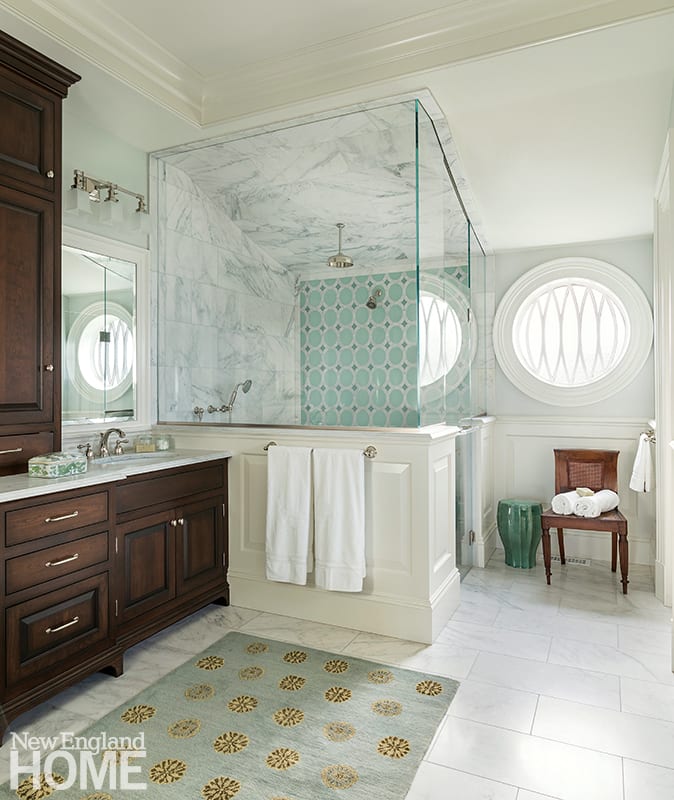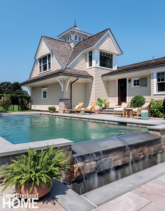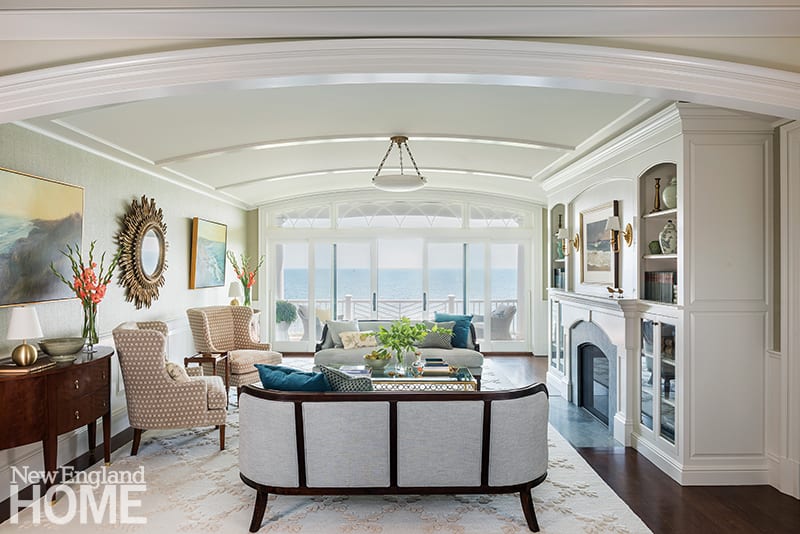 A classic house of shingle and stone seemed the perfect choice for such a special lot, and Newport architect Alec Tesa obliged, designing a Shingle-style beauty that looks like it’s been perched on this very spot since the Gilded Age. People familiar with Narragansett’s Coast Guard House (aka The Towers), built in 1888 by McKim, Mead & White, might recognize Tesa’s homage to the designers of that iconic building in the home’s entrance, where two peaked-roof projections are connected by the front door’s arched roof.