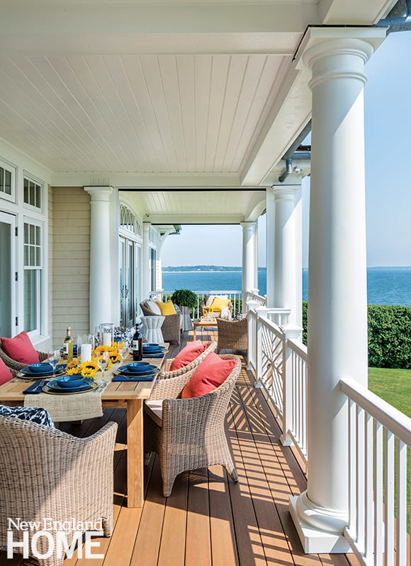 Envisioning a home away from the suburban bustle, they set their sights on Rhode Island’s south coast, ultimately settling on a parcel of land in the seaside town of Narragansett. The lot was especially appealing, Doug says, because it juts out from the coastline. “It probably has 270 degrees of views. We look back to the town of Narragansett, and across to Newport and Jamestown,
