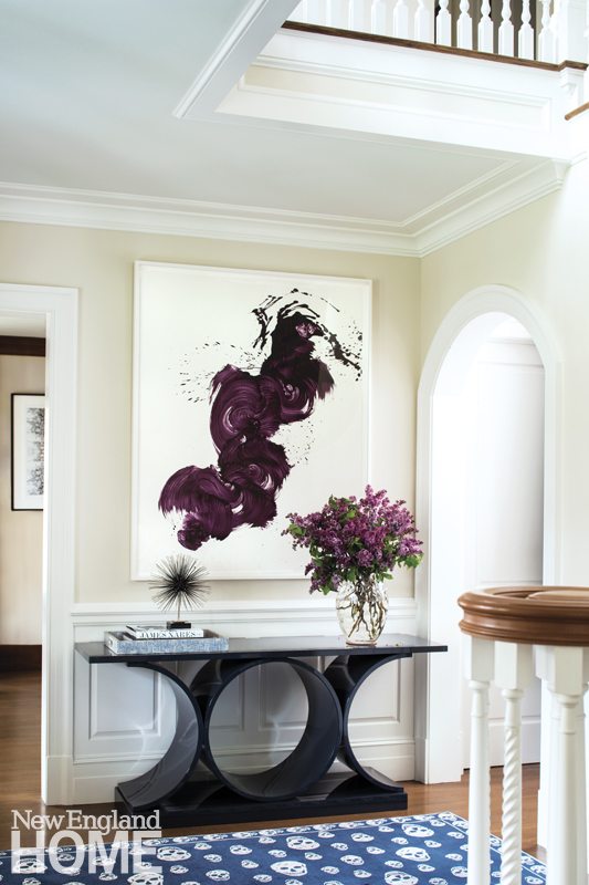 The foundation—a neutral palette—was just waiting for her touch. Her splashes of color pop up throughout the home, creating a fresh, contemporary spirit. To launch this change of attitude, Muse began by energizing the entry hall with the kind of composition that inspires people to use the front door. Artist James Nares’s bold print is paired with a custom console lacquered in Benjamin Moore’s high gloss Hale Navy. On the floor, Muse added an irresistible Alexander McQueen rug in royal blue.