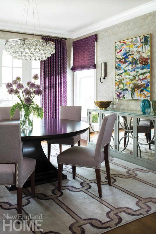 Charles Stewart dining chairs dressed in lavender Highland Court linen gather around the dark table like spring flowers. Above hangs a gleaming Arctic Pear chandelier by Ochre. “We needed a soft color for the seats to offset the strong purple silk curtains,” the designer explains. “The chandelier is for bling.”