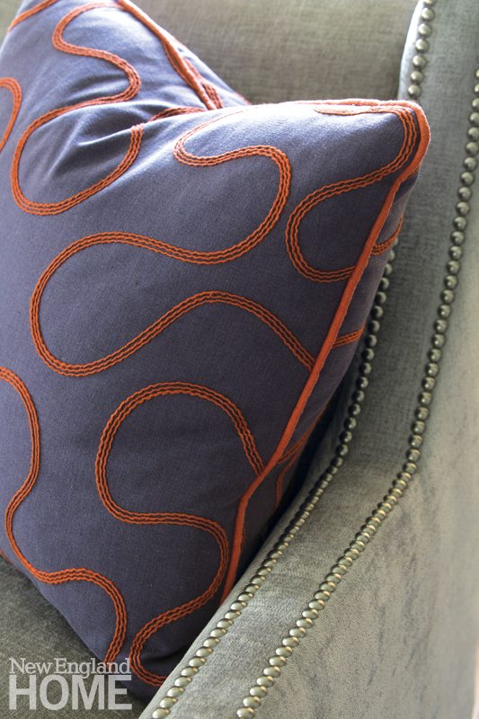 Aware that too much of anything is never good, Muse doesn’t overload her clients. Working primarily with a mix of purple and orange—Wendy’s own choice—Muse introduced plenty of muted shades and low-key patterns that are lively, but not daunting. A peek into the living room reveals armchairs clad in a subdued but attention-getting orange Romo pattern. Across the way, the chenille sofa hosts pillows covered in an embroidered orange-and-purple Robert Allen material (“I fell in love with this one and played the whole room from there,” says the designer). There’s an orange-and-white lumbar pillow to continue the theme, and shapely orange Dynasty vases on the mantel. But there’s also a surprise. Two X-base stools flaunt a stripe of blue and white that ties in with the entry’s console. Everything is so harmonious it’s difficult to imagine one element without the other.