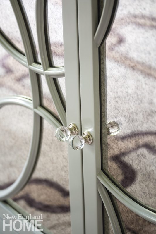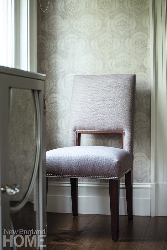 The walls of the adjacent dining room were hand-painted and stenciled when the Lynches arrived. But whereas some designers might balk at combining punchy art with a patterned backdrop, Muse is not among them. Over the mirrored console hangs a lively painting, by Judith Kruger, that complements the space. “Art should work in the context of the room, not be matchy-matchy,” Muse says.