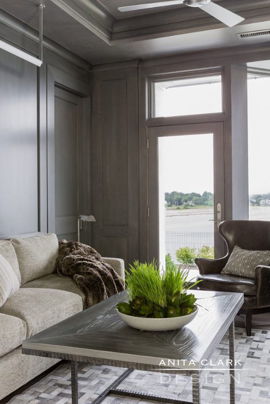 So dark, heavy rooms gave way to an overall sense of lightness in this Swampscott renovation. The palette was inspired by the ocean, the surrounding rocks and sandy beaches. The distressed hardwood floors were finished in a hue reminiscent of the ocean floor. The walls are all done in muted shades of taupe, a perfect backdrop to the sea of greens and blues used throughout the home in different intensities and values.
