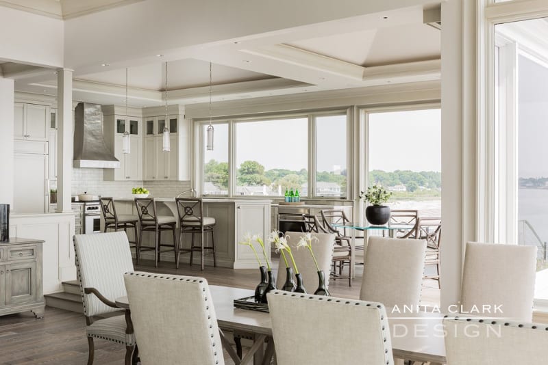 Fussy ornamentation was exchanged for hand-glazed custom millwork. Because the expansive great room had to be as hardworking as it is beautiful, areas for living, dining, cooking, and working were clearly defined. There’s a built-in that hides a fully functional home office (with files and printers) behind doors. Most of the furnishings are custom—including what the Hickory Chair company describes as the largest sectional sofa they’ve ever made. Throughout the home, furnishings are oriented toward the water to enhance the indoor-outdoor connection.