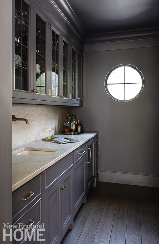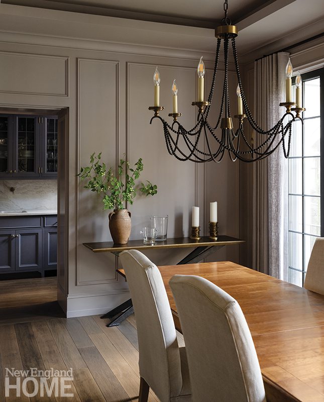 Blessed with creamy stucco walls, stout masonry trim, and ebony French doors that open to the front and rear gardens, the new home’s glamorous visage carries through to the interior, where paneled walls and passageways conspire with French oak floors and generous expanses of stone to give the house a venerable old-world appearance. “The clients wanted the house to feel like it was always there,” says Paratore. At the same time, he adds, “they didn’t want the house to be grandiose.”