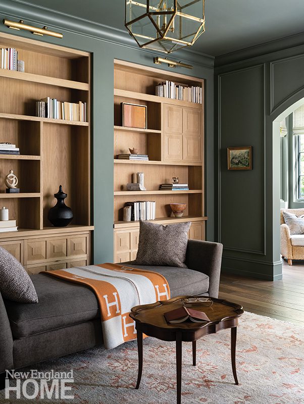 Color does come into play in some secondary spaces, as well as the library, whose dusty green walls and ceiling offer cozy contrast to the airy living room next door. An understated archway is all that separates the latter from the kitchen, which pairs cool painted cabinets with warm paneled oak and forgoes upper cabinets for open shelves to keep dishes and cookware in easy reach. A second island doubles as a serving station for the window-wrapped breakfast bay, which surrounds diners in greenery and views of the garden relics out back.