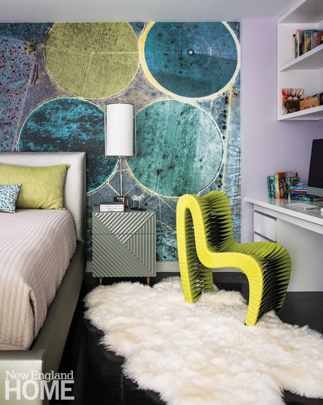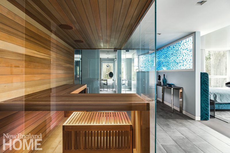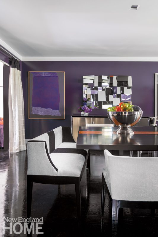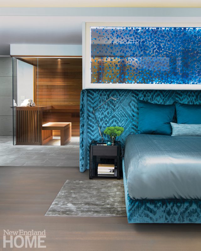 An existing green kitchen and red powder room are now joined by an orange-and-purple living room, a lacquered plum dining room, a music room with red art and accents, and a calming blue primary suite—the latter of which was top priority for the busy couple. “They both have stressful jobs, so this space functions as their retreat,” says Kaehler. “It has everything you might need: a wet bar, a sauna, a fireplace, and a porch with a spa. Jack refers to it as the ‘James Bond suite.’ ”