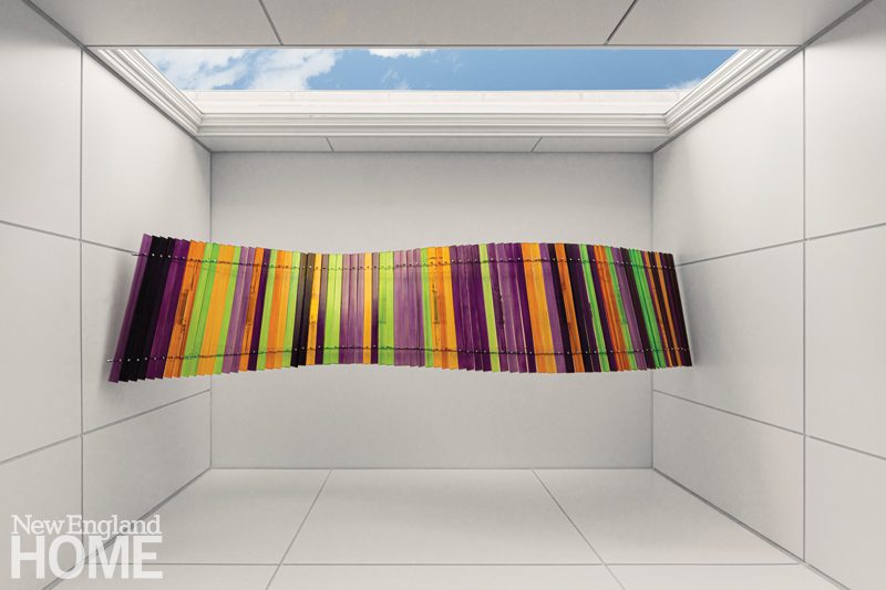 While the rear of the house was completely reworked, the front facade remains largely inconspicuous, save for a sleek new horizontal window above the door. Kaehler and Montgomery collaborated on this detail, which frames a sinuous Venini glass light fixture that recalls a xylophone. That playful piece serves as a hint to visitors of what’s to come. The client directive for the interiors was clear: color, color, and more color.