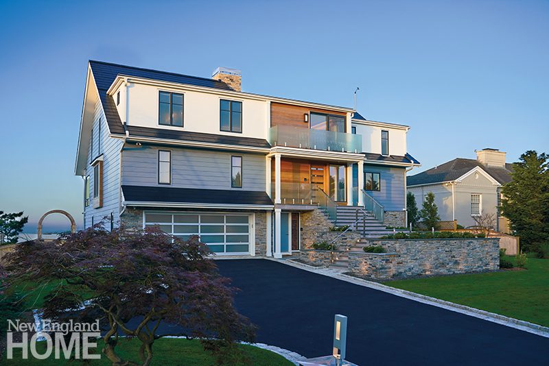 A mix of pitched and flat roofs and a blend of siding materials—a poly-ash composite that mimics gray cedar shingles for the garage and first floor, cream-colored stucco for the top level, and a section of natural cedar that adds an extra dose of character to the entry and the deck above it—give the front plenty of visual interest. The rear has new steel framework and hurricane-proof glass windows, the better to withstand the next major storm.