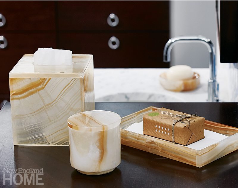 Labrazel’s product line features wastebaskets, tissue covers, soap dispensers, canisters, tumblers and brush holders, soap dishes, trays, and pump tops. What differentiates these accessories from the kind you can find in dozens of department stores? Craftsmanship and choice materials, which include gold and silver leaf over ceramic and wood, travertine marble, mouth-blown glass, polished alabaster, Capiz shell, cast cement, limestone, bronze, hand-painted enamel, onyx, polished nickel, and crystal.
