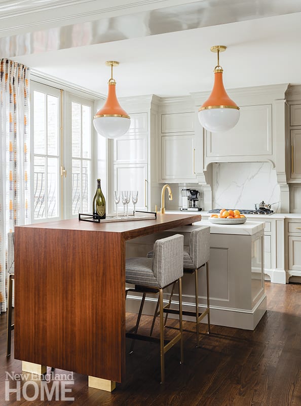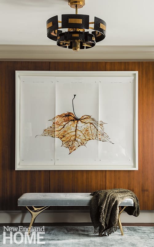 One of the most dramatic design decisions born out of the collaboration between designer and architects was installing simple walnut wall panels that “float” over the existing moldings. “Instead of ripping everything out, we introduced contemporary elements, so both the traditional and modern details can be enjoyed,” says Williams.