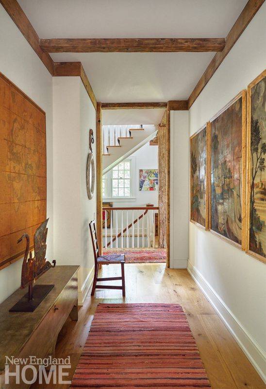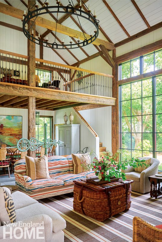 The plan Sanders devised involved taking apart and moving the largest of the three barns and connecting it to the house by way of a new wing that includes a large kitchen and pantry, a mudroom, a first-floor bedroom suite, two-car garage, and two second-floor bedrooms. The reconstructed barn is a magnate for family gatherings, yet with its rustic beamed ceiling and comfortable furnishings, it feels cozy enough for solitary evenings by the fire.