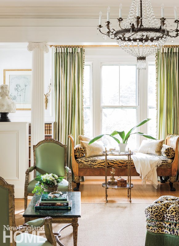 Whalen’s favorite living-room acquisition, though, is the antique Adams-style walnut, parcel-gilt, and pen-work daybed. Tiger-print upholstery and pillows clad in antique Fortuny fabric lend the bed a regal presence that suits the home’s classic architecture. The bed is parked in a book-filled alcove that’s framed with grand fluted columns. Whalen uncovered the columns minus their capitals in the basement and reinstalled them—with new capitals—where they’d originally stood. The columns, which mirror a pair at the opening between the foyer and living room, square off the sunny living room, restoring symmetry and balance, elements the designer always strives for in her work.