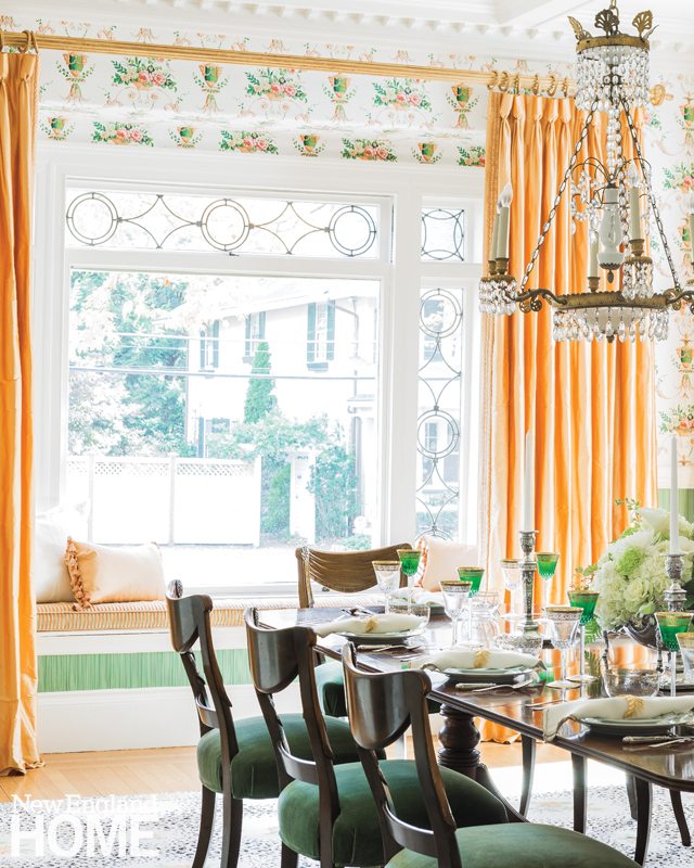 Fortunately, for the most part the old oak floors were in fine condition. The dining room’s original leaded-glass window had not fared so well. But, as Whalen sees it, repairs were well worth the effort. Beyond its light-giving function, the gorgeous window speaks to the home’s pedigree and partners like a dream with the white woodwork and charming Brunschwig & Fils wallcovering.