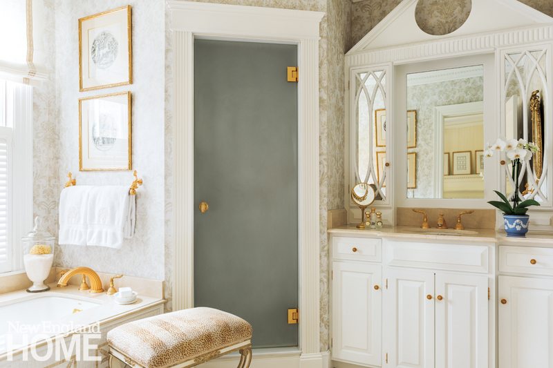The master bath was gutted, and in its stead rose an elegant bath with a marble floor and countertop along with posh gold fixtures. A cleverly angled shower with a sandblasted door slides in between the handsome vanity and tub. “I was obsessing,” the designer tells us. “I was so concerned about everything fitting, I made a model for this room.”
