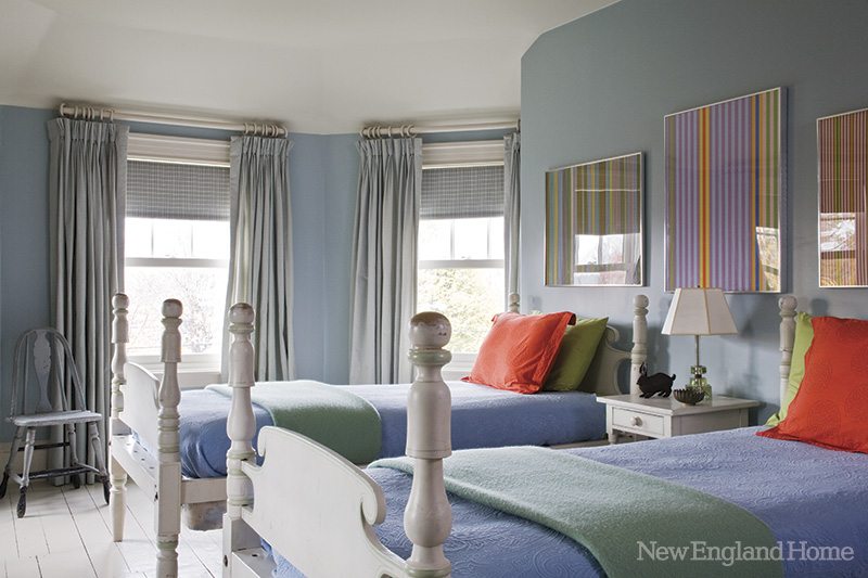 In another guest bedroom, Miller had already concocted the palette of robin’s-egg blue and spring green when a dear friend bequeathed him a set of Gene Davis prints, whose multicolored vertical stripes tie the space together and give it a contemporary edge. “This is a classic New England cottage, but the artwork is very modern,” the designer notes. (Etchings by Sylvia Plimack Mangold hang above the living room sofa, and a Kate Shepherd work presides over the dining room.)
