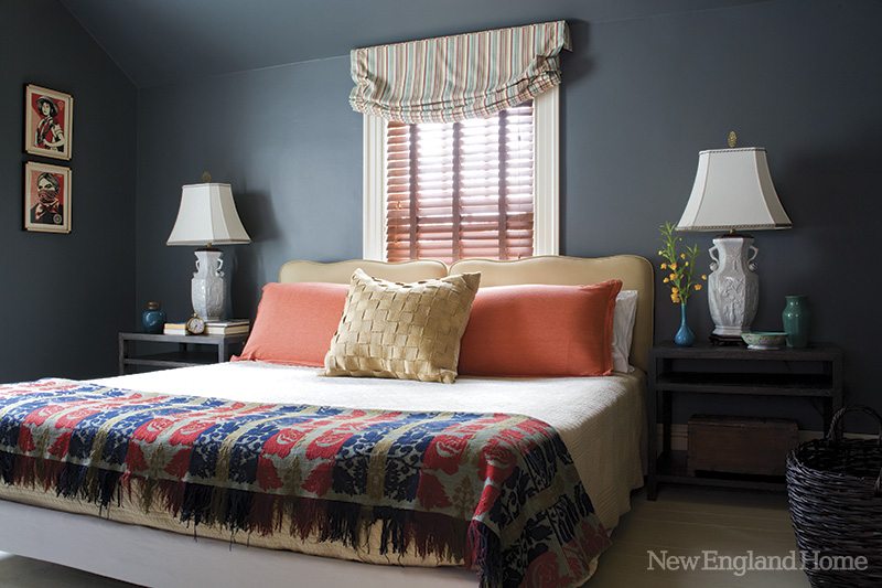 Other bold combinations enliven the upstairs bedrooms. In one guest room, the designer accented the dusky blue walls with touches of red, coral and white.