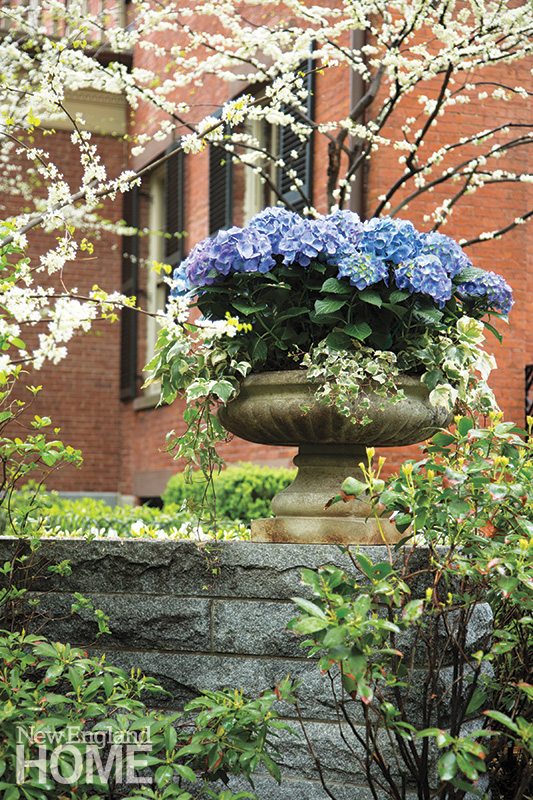 Care and maintenance for the showcase spot is the responsibility of Paul Lee, principal of Foliaire in Boston. With every change of the seasons he and his crew ramp up their fine-tuning, seeing to everything from pruning to updating containers. Pots of hydrangea introduced in spring, say, are underplanted with pretty variegated ivy or white New Guinea impatiens for summer. With fall’s arrival, out go the fluffy hydrangeas and in their place come classic mums and robust kale, followed, as temperatures begin to drop, by dwarf evergreens. Frosted with snow, the trees will interject a subtle hint of holiday enchantment—a boon for the owners when they view their garden from indoors. Something Messervy, who considers every aspect of the stellar gardens she designs, certainly planned. •