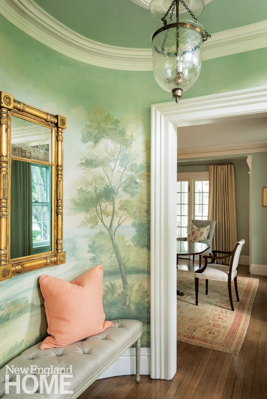 The home is furnished with “a healthy mix of English, American, Swedish, French, and Italian antiques, along with painted pieces, wicker, marble, and metal,” says Saypol. Patterns are subtle and layered, except for the statement-making wallpaper in the powder rooms and formal entry. “They’re spaces you’re only in for a few minutes, so the impact is quick,” says the designer.