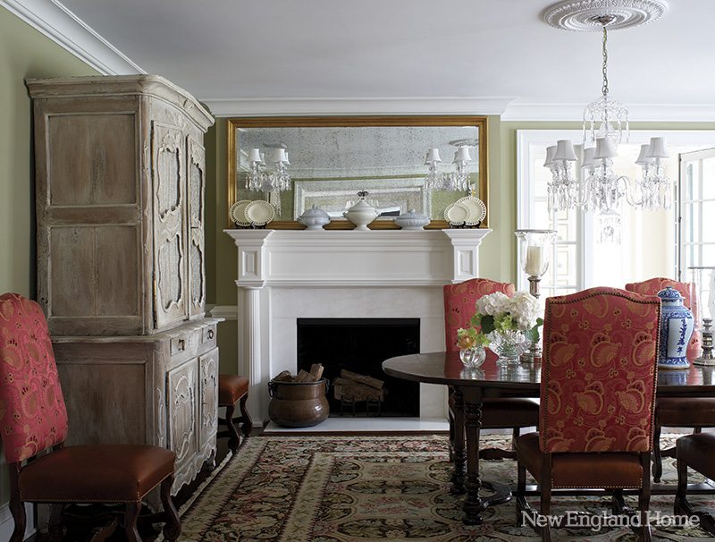 The dining room, with its Waterford chandelier and stately fireplace, exudes formality. Waterford sconces are mounted on the gold-framed mirror above the fireplace. The antique rug—like most rugs in the house—hails from Oscar Isberian in Chicago. Walls are painted Farrow & Ball’s Stone White.