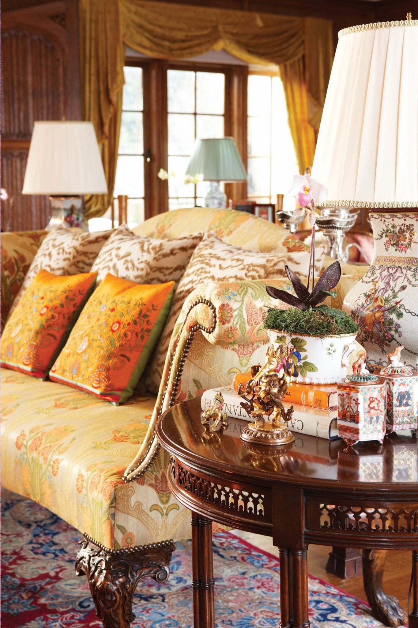 In the sitting room, the golden paint is an accent for the oak paneling. A wide brick fireplace with an Indiana limestone surround and mantel takes center stage. On the mantel and in niches in the paneling above sit Chinese porcelain pieces collected by Wadia’s grandfather as well as antique Indian dolls of ivory and gold leaf.