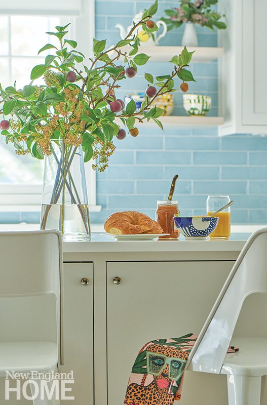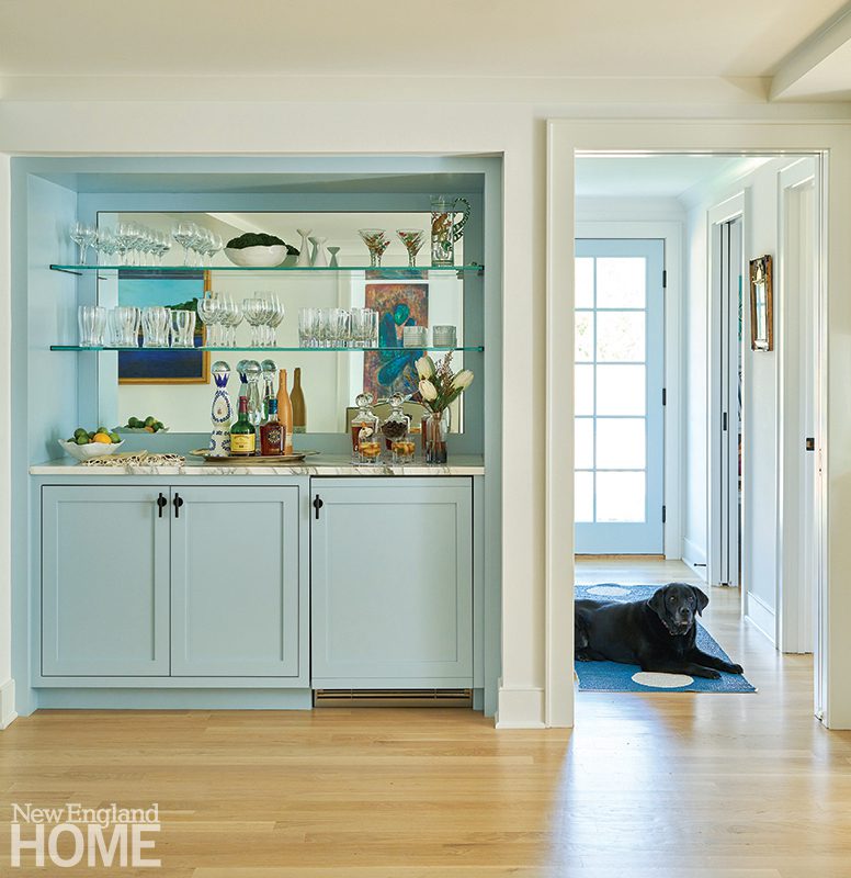 The airy new kitchen sports white upper cabinets, interrupted here and there by open wood shelves, that float like clouds on an expanse of glossy sky-blue tile. Shiny white quartz tops the lower cabinets and the island. “We often do honed surfaces,” De Maria says, “but this kitchen doesn’t get a lot of natural light, so we chose reflective surfaces.” And for a sophisticated touch, the designers added a bar, outfitted in pale blue cabinets and a mirrored back, to suit the grown-up new kitchen.
