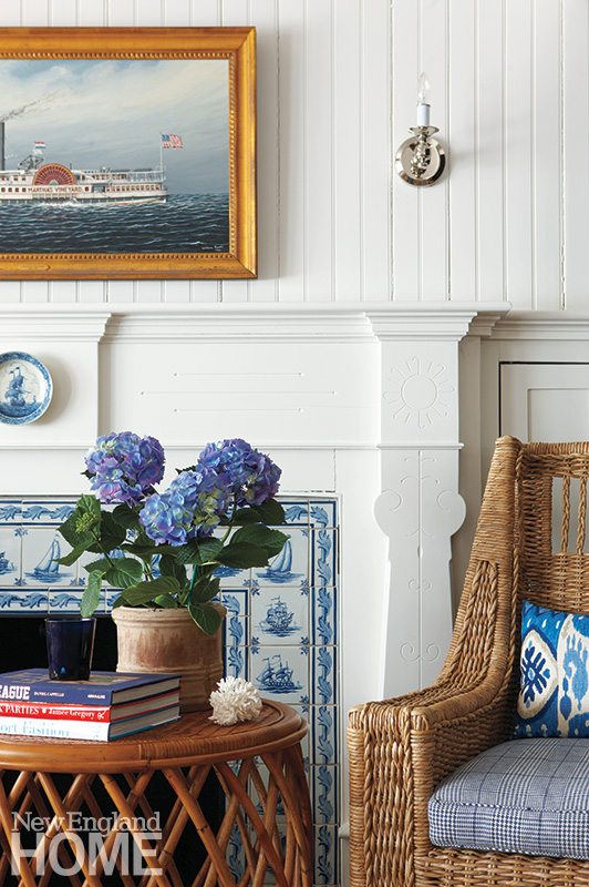 The sophisticated look continues in the living room, where white sofas, rattan chairs, and a zebra-print rug layered on sisal are relaxed counterpoints to the beadboard walls and the fireplace with its classic molding and blue-and-white tiles.