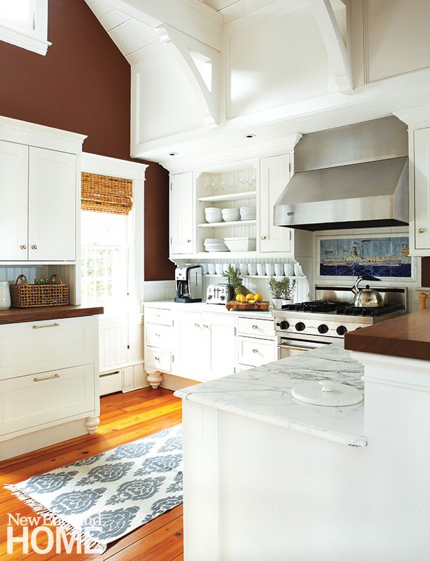 The rooms in the 3,000-square-foot house are small, but laid out in a plan that takes advantage of the view from every space. Even from the kitchen, a glimpse of boats churning the water in the harbor can be seen through the breakfast area and dining room. “The kitchen was in nice condition,” says Rogers, but its attractive architectural details were lost in a sea of white. “It needed a pop of color to highlight the vaulted ceiling and beams overhead,” the designer explains. Paint the color of rich milk chocolate provided the contrast that lets the details shine.