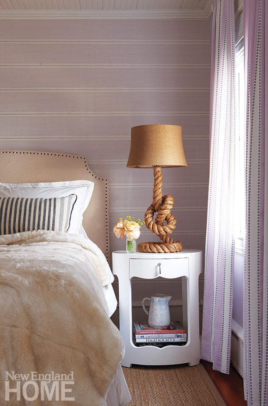 The daughter’s room is the only bedroom on the first floor, and Rogers gave it the lavender treatment with an Osborne & Little wallpaper hung horizontally on the wall behind the bed. “I started with the wallpaper,” he says. “Then I found the vertical-striped fabric with lavender for the draperies, and then I painted the walls lavender.”