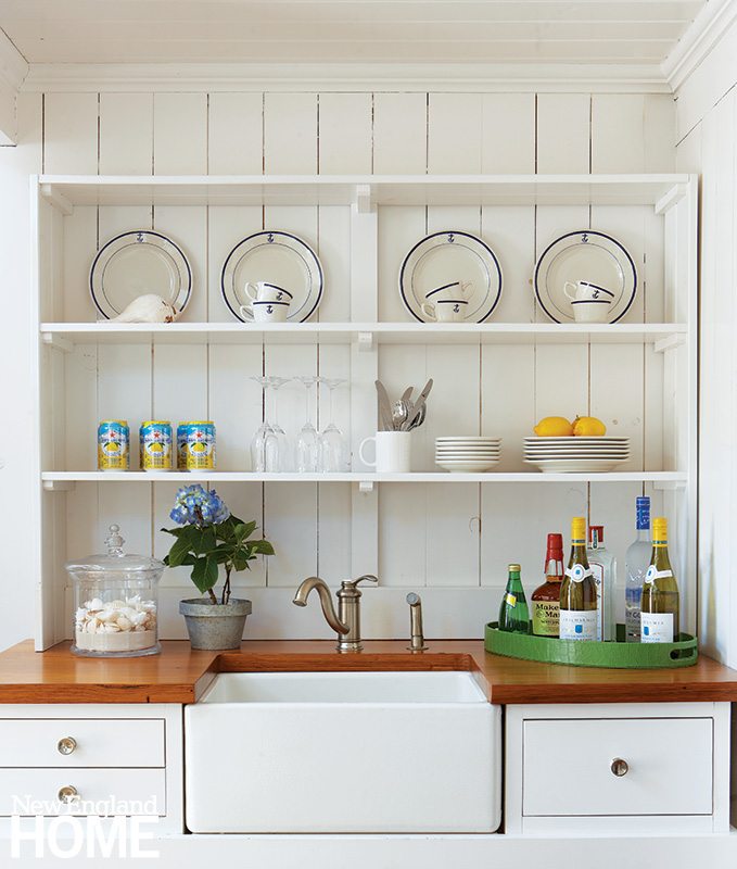Some of the doors throughout the house were treated to new framing, and an elevator a previous owner had installed was removed. On the first floor, the onetime elevator space was transformed into a perfectly placed wet bar between the kitchen and water-facing porch. On the second floor, the shaft created space for a linen closet.