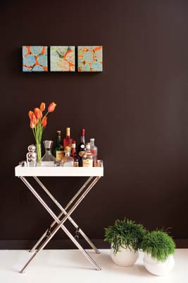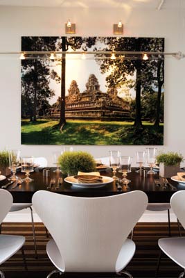 From the glossy epoxy white-painted floors to the metal accents and modern furnishings, Cappoli keeps the look sleek. But then he introduces unexpected touches such as the deep chocolate brown that shows up on some of the walls, in the rugs and in the Brazilian granite of the kitchen counters, or the punch of bright orange accents in the otherwise neutral dining room and the serene master bedroom. Green is another repeating theme in plants, a painting of fresh apples, a lamp in the bedroom, a green throw across the sofa and a large photo in the dining room of Angkor Wat in all its deteriorating lushness.